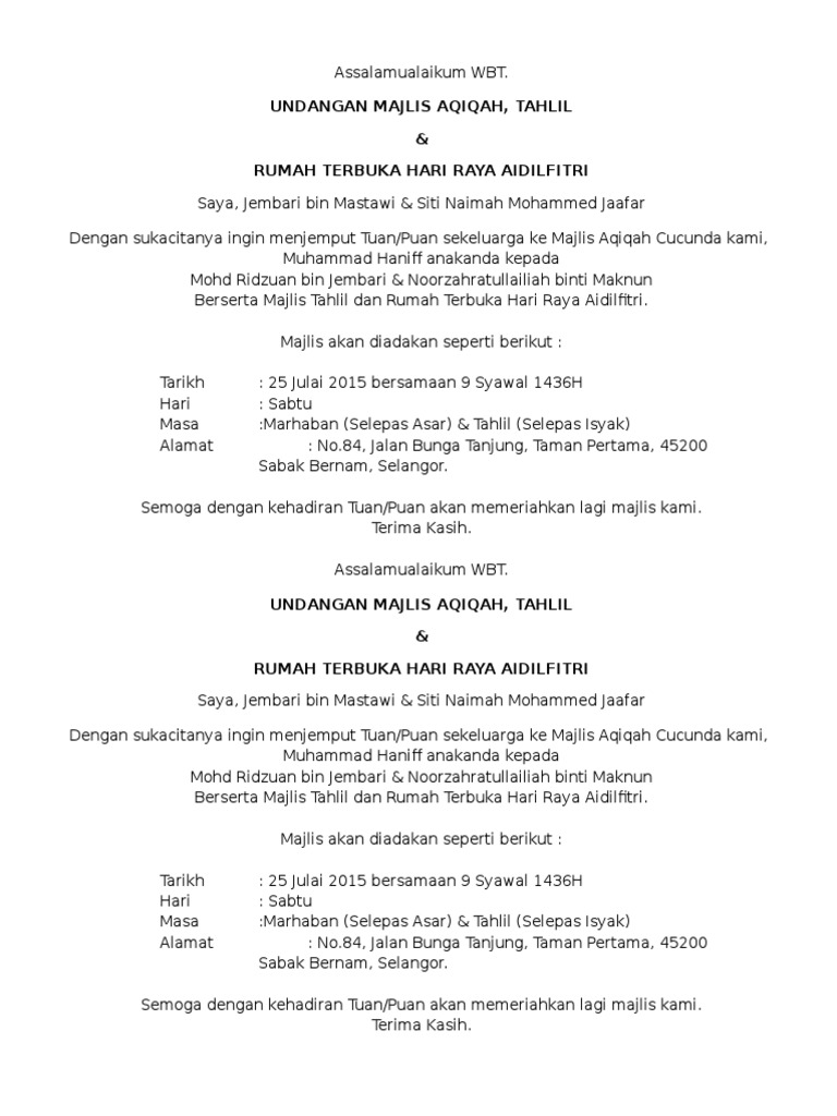 Because it depends on the lunar calendar, the date varies each year. Hari terbuka & sempena jamuan hari raya ke majlis. Jemputan ke rakaman muzikal komedi raya ke dik. *jemputan rumah terbuka hari raya cina* sempena merayakan tahun baru cina. Assalamualaikum, saya abdul malek bin manap dengan segala hormatnya menjemput tun, tan sri, datuk, datin, tuan dan puan semua ke majlis sambutan harijadi anak lelaki saya azfar ikhwan bin abdul malek dan juga meraikan rumah terbuka hari raya aidilfitri pada 3 november 2007 jam.