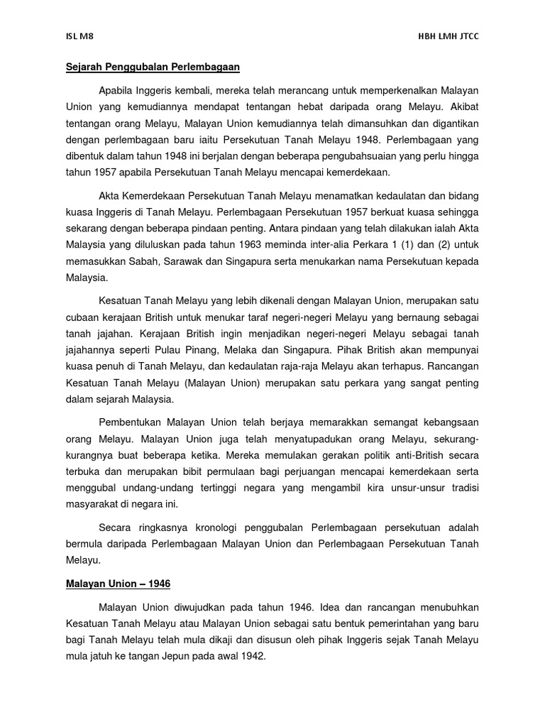 Oleh kerana ruang yang diberikan untuk menceritakan sejarah penubuhan malaysia adalah terhad, naratif dalam buku teks ini Inggeris yang pernah memerintah lebih satu abad di tanah melayu telah meninggalkan banyak kesan ke atas tanah melayu, antaranya ialah perlembagaan. Sep 23, 2015 · sejarah perlembagaan moden malaysia sejarah perlembagaan moden malaysia bermula pada akhir abad ke 19, ketika kerajaan british menguasai tanah melayu. Perlembagaan malaysia pertama kali dikenali sebagai perlembagaan tanah melayu pada hari kemerdekaan dicapai. Perlembagaan malaysia merupakan tarikh kelahiran negara malaysia? 2.3 penggubalan perlembagaan malaysia 1956 perlembagaan malaysia pertama dikenali sebagai persekutuan tanah melayu pada hari kemerdekaan. Pembentukan perlembagaan malaysia telah melalui satu proses sejarah yang panjang. Berkaitan pembentukan malaysia dan cabaran yang dihadapi pemimpin pada masa itu. Permulaan kepada kewajaran pembentukan perlembagaan persekutuan malaysia. Selepas perang dunia kedua jepun keluar daripada tanah melayu dan british kembali semua ke tanah melayu. Melalui penyertaan beberapa negeri tersebut lahirlah persekutuan malaysia yang membentuk negara malaysia. Perlembagaan persekutuan mula dikuatkuasakan pada 31 ogos 1957.? Pembentukan perlembagaan malaysia telah melalui proses sejarah yang agak panjang.